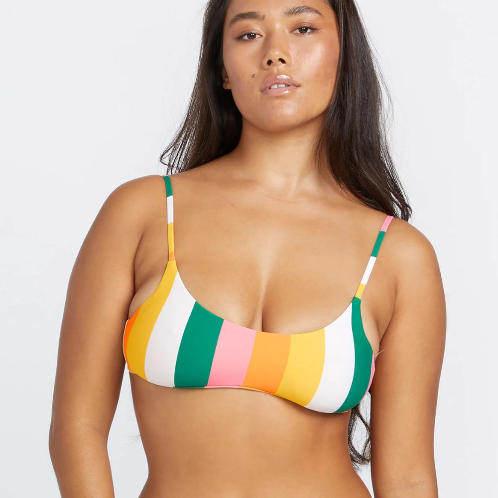 A 70’s inspired striped scoop neck bikini top. Removable bra cups and adjustable shoulder straps ensure a comfortable fit.