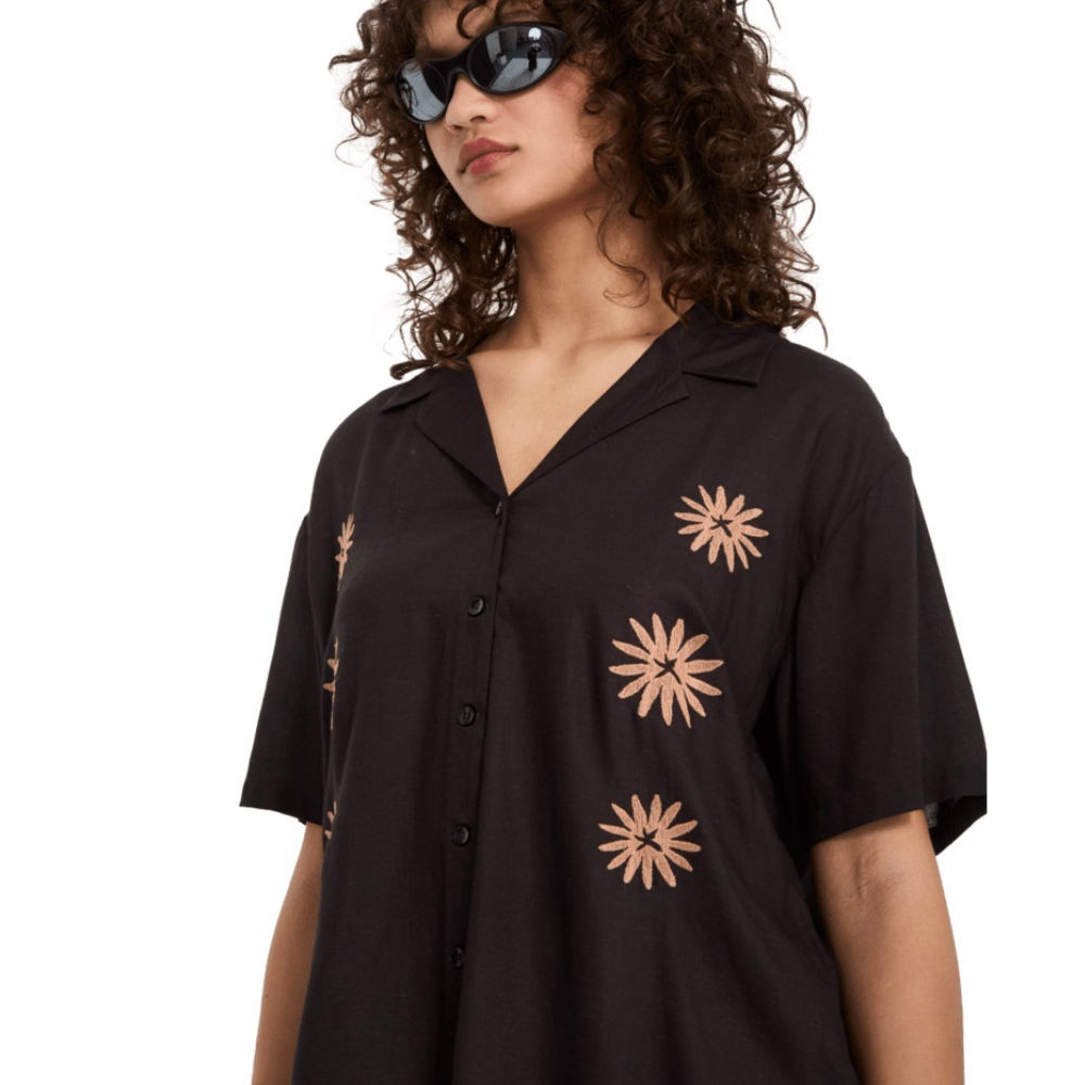 Losvallend shirt met korte mouwen en klassieke kraag, afgewerkt met bloemenborduurwerk langs de voorzijde.